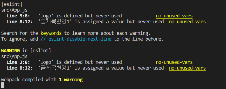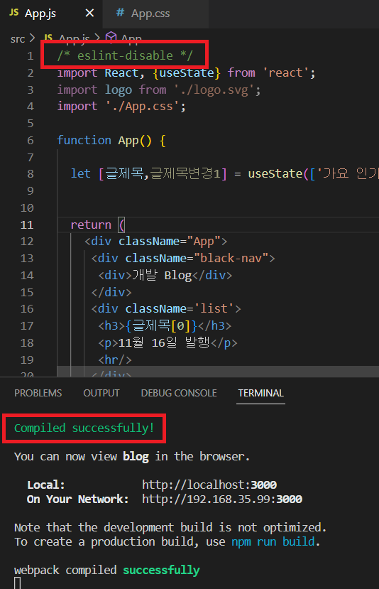 ▲ 파일 맨 위에 /* eslint-disable */ 를 적어서 WARNING 이 뜨지 않는다!