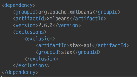 stax가 org.apache.xmlbeans 아래에 있기 때문에 pom.xml에 제거하러 가보자.
