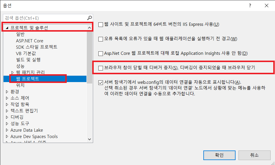 브라우저 창이 닫힐 때 디버거 중지, 디버깅이 중지되었을 때 브라우저 닫기를 체크 해제 후 저장한다.